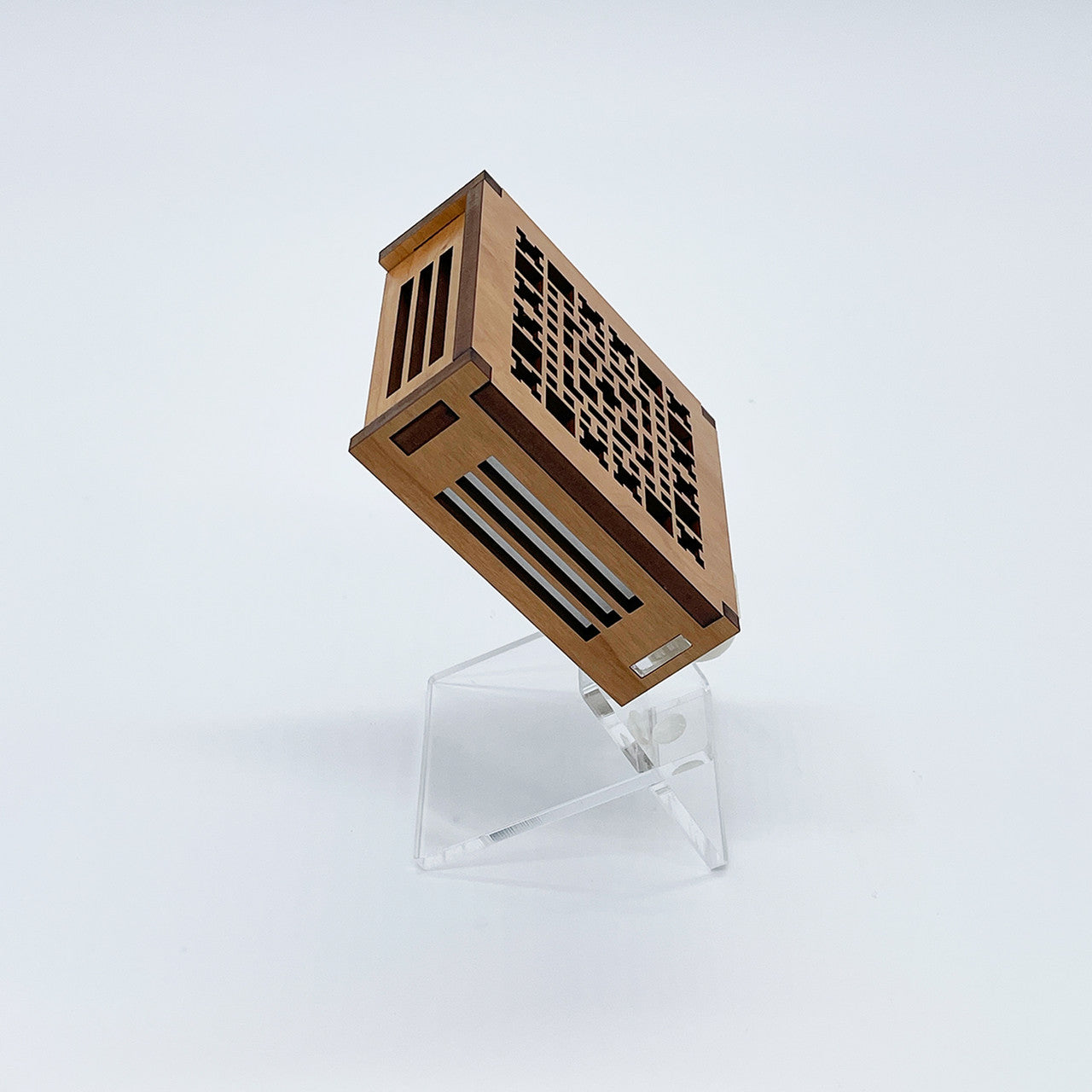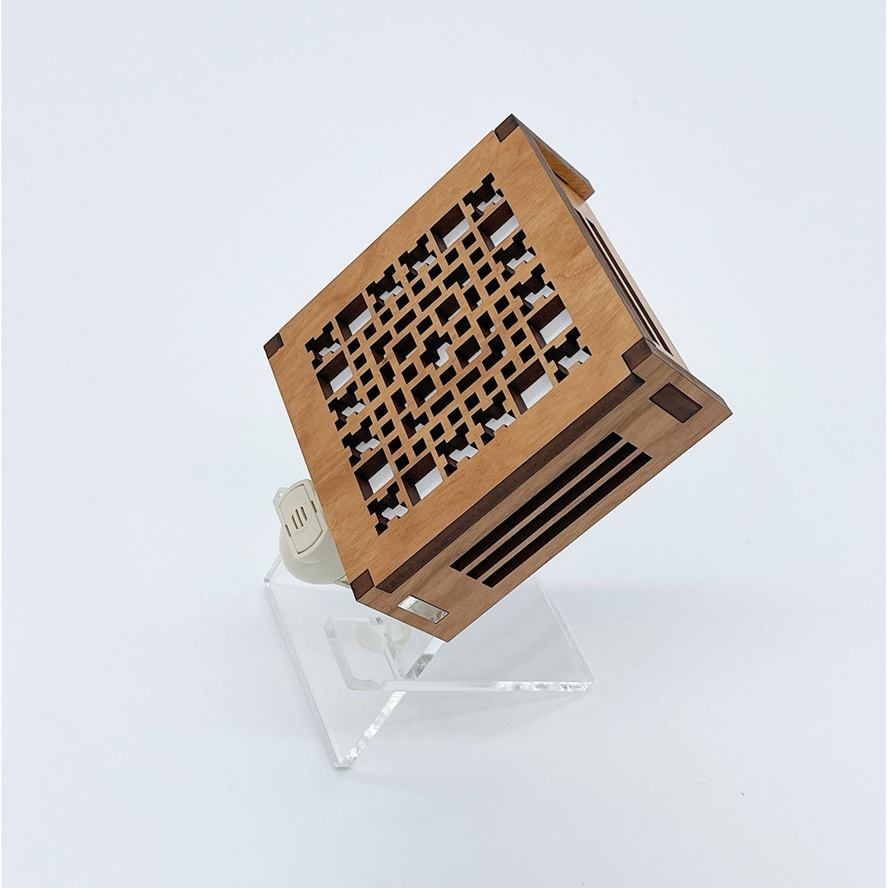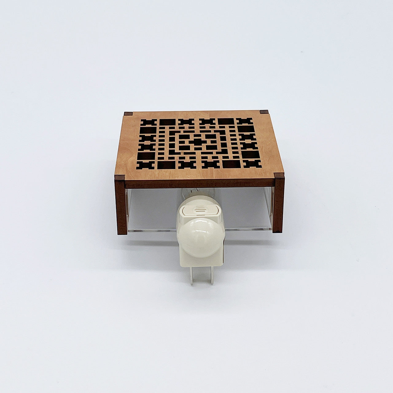 Our Frank Lloyd Wright night lights are made with cherry veneered MDF. This elegant night light feature slats on the top and sides with a clear acrylic bottom panel to allow more light to shine through. The base is white and it measures 4" x 4" x 1.5".