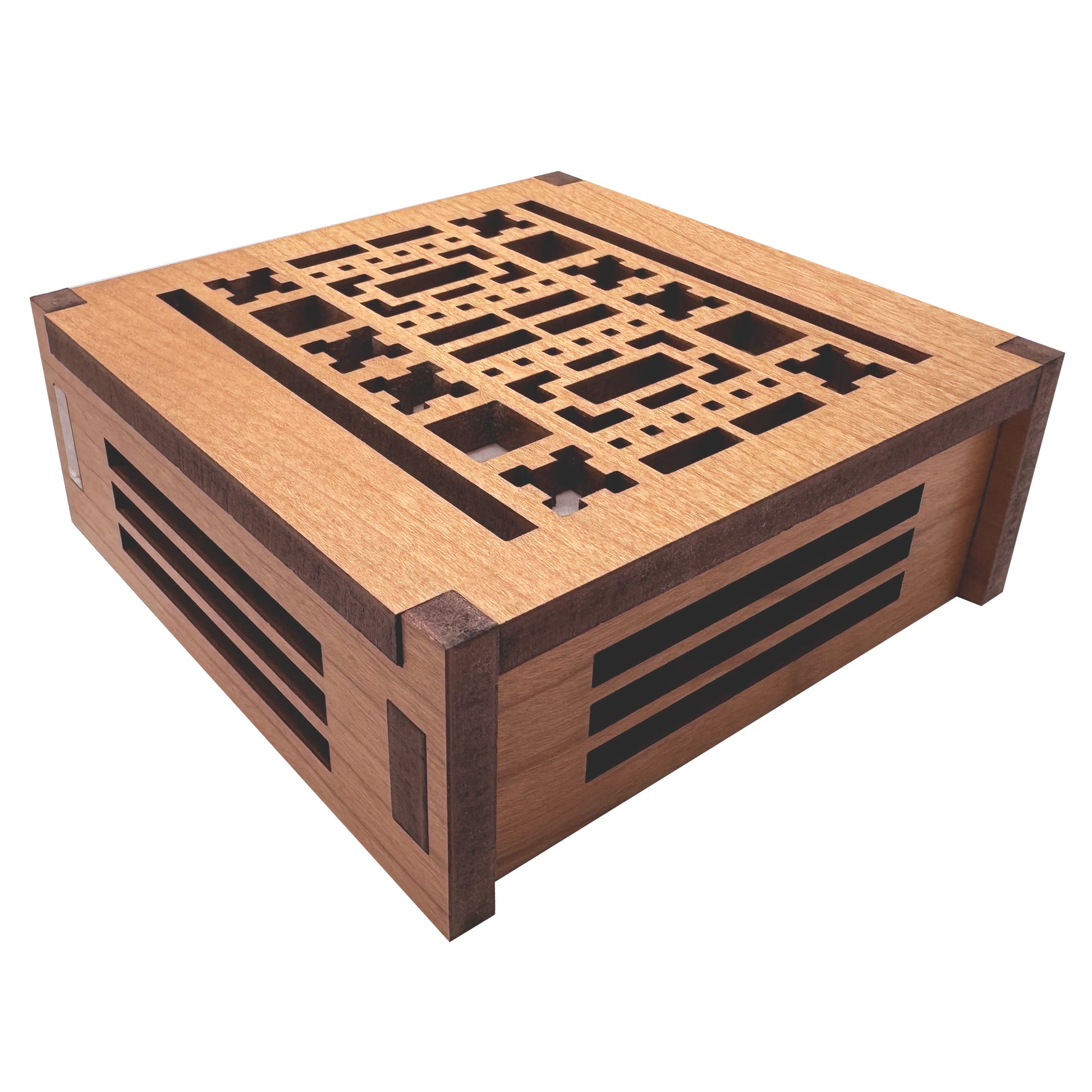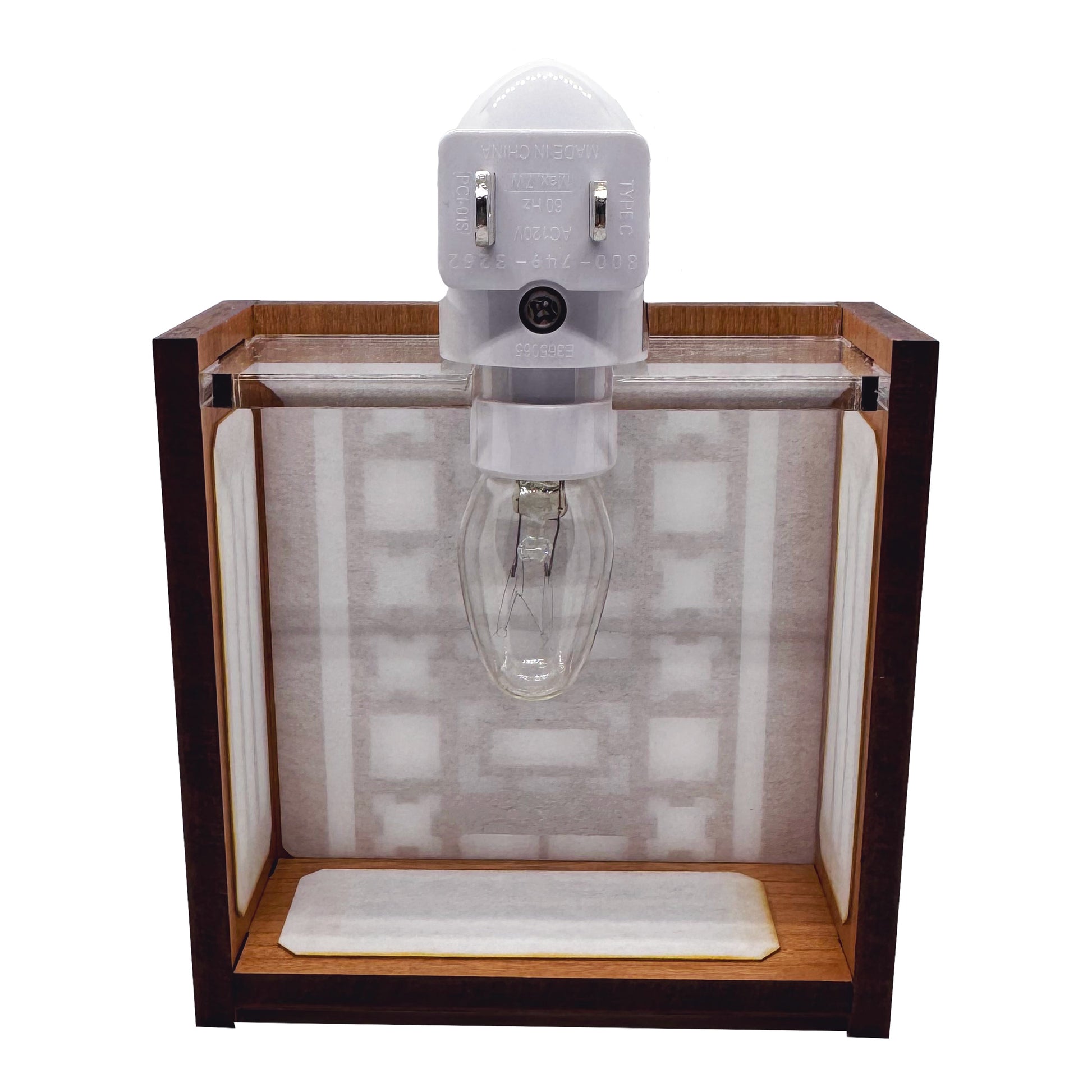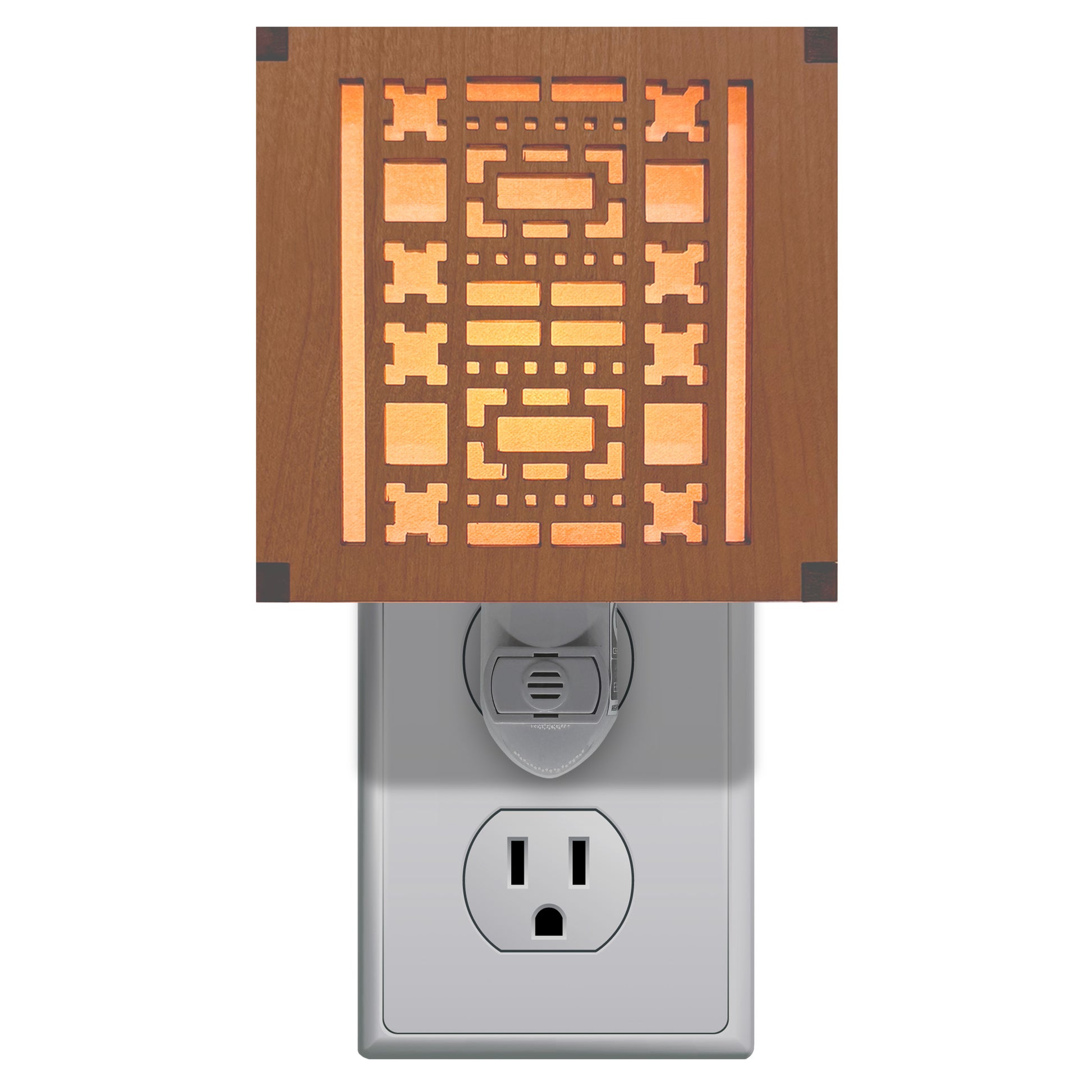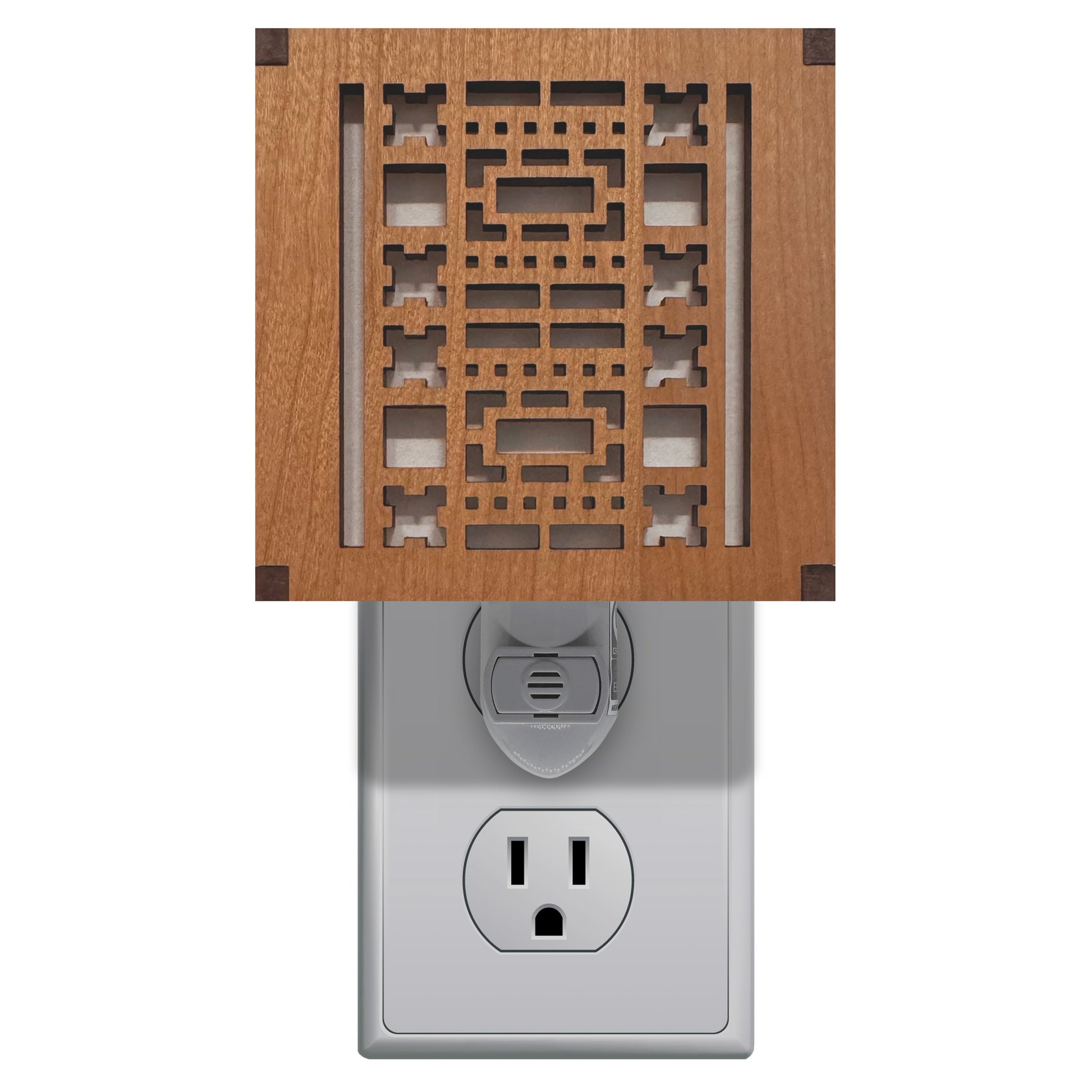 Our Frank Lloyd Wright night lights are made with cherry veneered MDF. This elegant night light feature slats on the top and sides with a clear acrylic bottom panel to allow more light to shine through. The base is white and the nightlight measures 3.875" x 3.875" x 1.5".