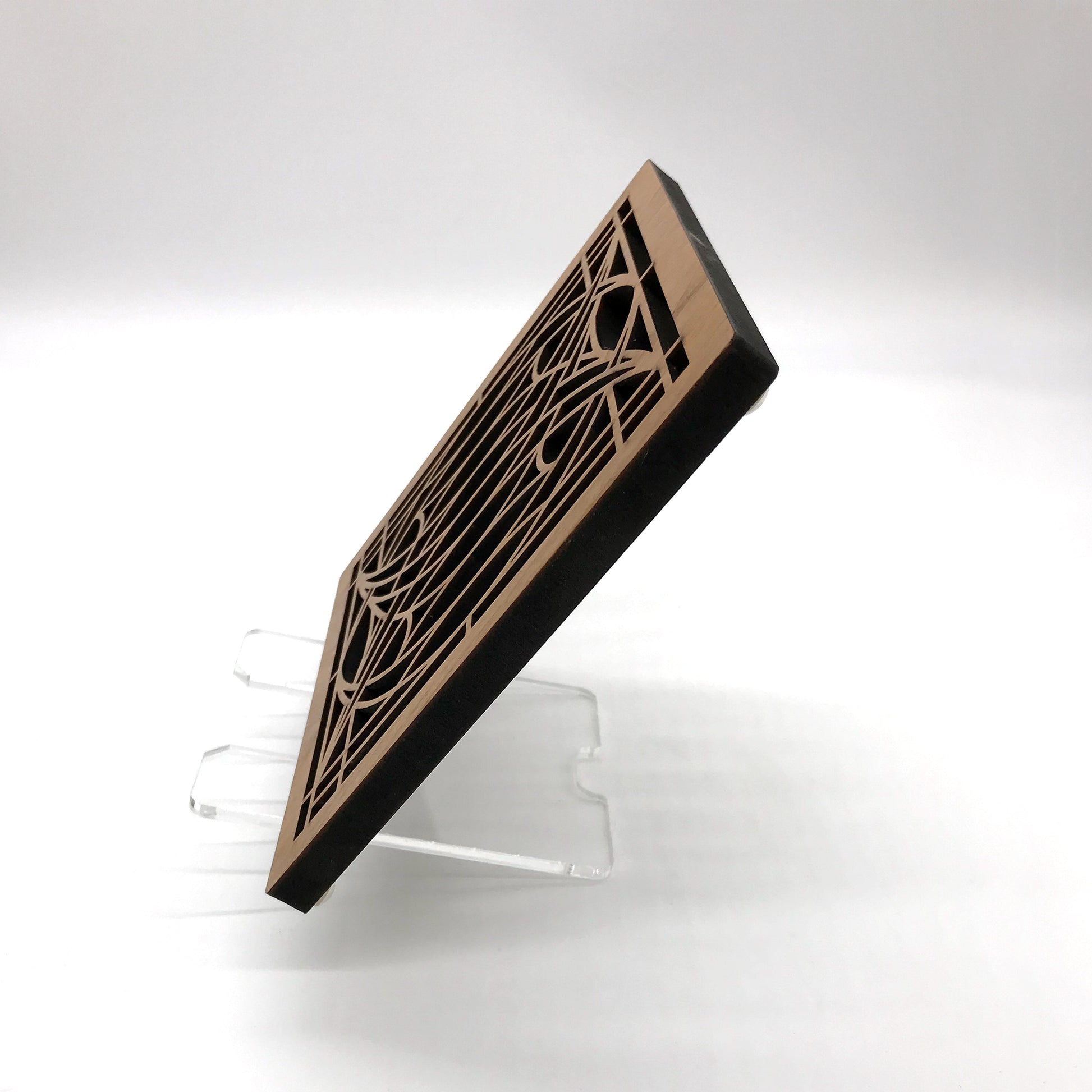 Our trivets are made from 1/2" thick cherry veneered MDF. This wonderful addition to your home comes with rubber feet on the bottom, and can withstand heat up to 400° F. Trivets can also be used as wall art using the included mounting hardware. 7-3/4" x 7-3/4" x 1/2". Acrylic stand not included. All AlaModerna products are made in the USA.