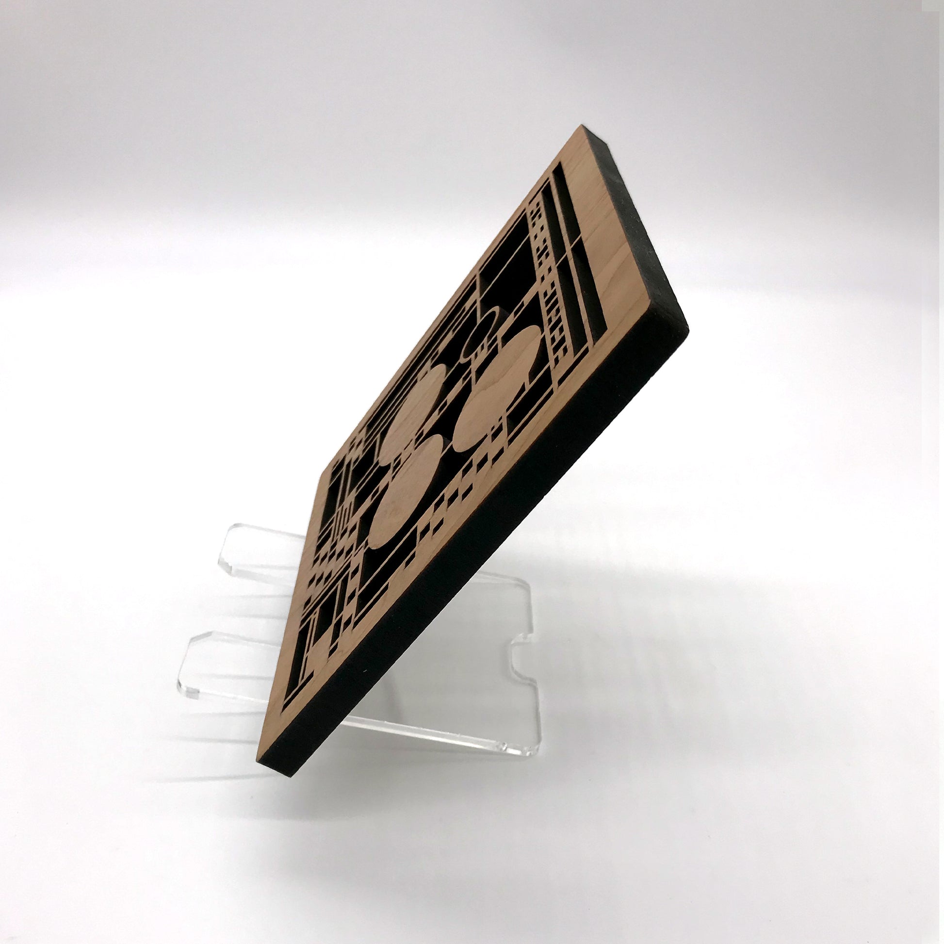 Our trivets are made from 1/2" thick cherry veneered MDF. This wonderful addition to your home comes with rubber feet on the bottom, and can withstand heat up to 400° F. Trivets can also be used as wall art using the included mounting hardware. 7-3/4" x 7-1/2" x 1/2". Acrylic stand not included. All AlaModerna products are made in the USA.