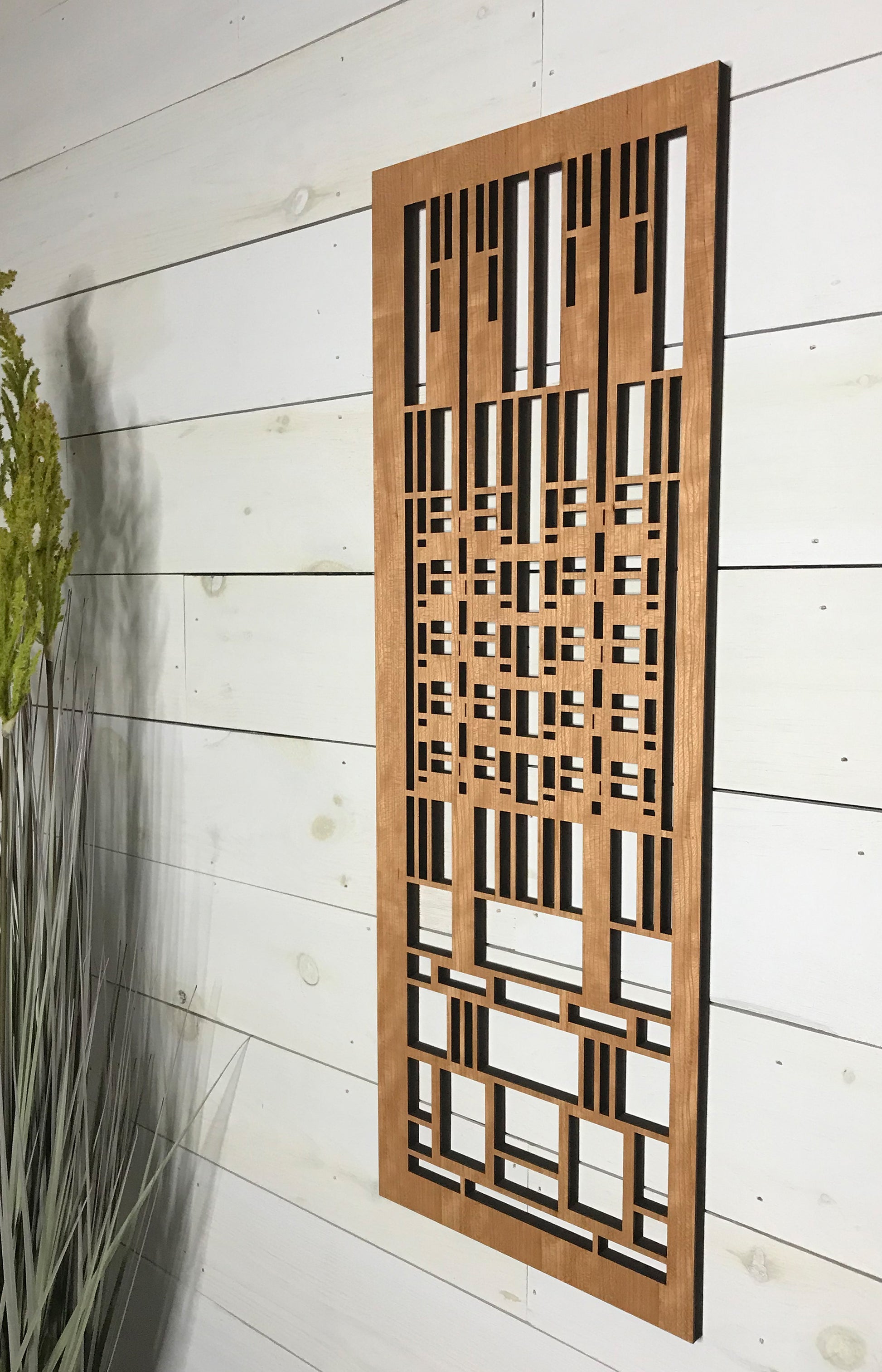 Our wall elements are made with cherry veneered MDF. This beautiful wall element measures 11-1/2" x 31-1/2" x 1/2". Includes one sawtooth hanger and hardware. All AlaModerna products are made in the USA.