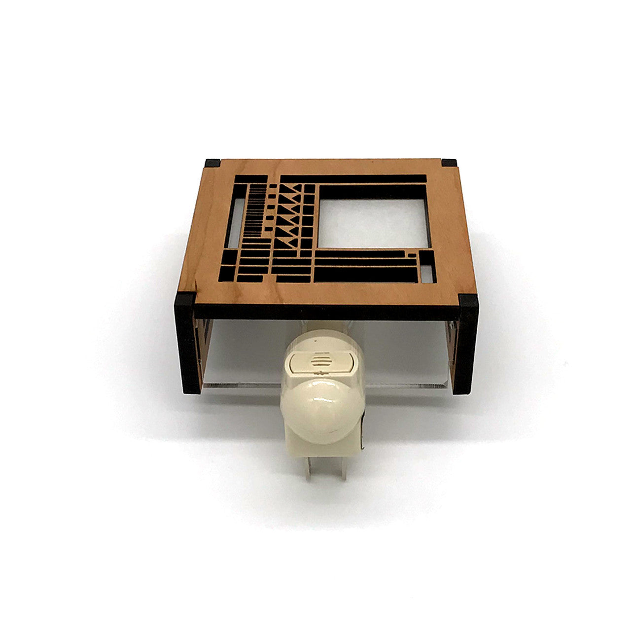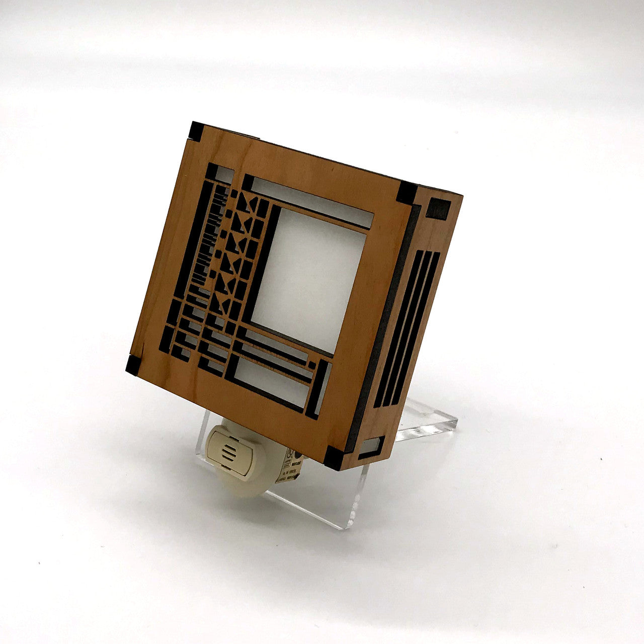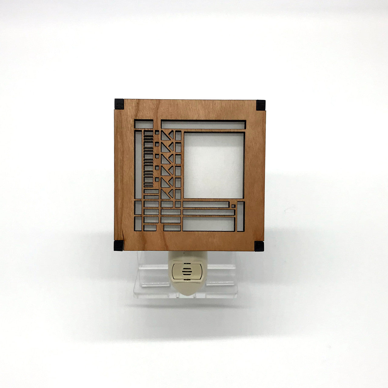 Our Frank Lloyd Wright night lights are made with cherry veneered MDF. This elegant night light feature slats on the top and sides with a clear acrylic bottom panel to allow more light to shine through. The base is white and the night light measures 4" x 4" x 1.5".