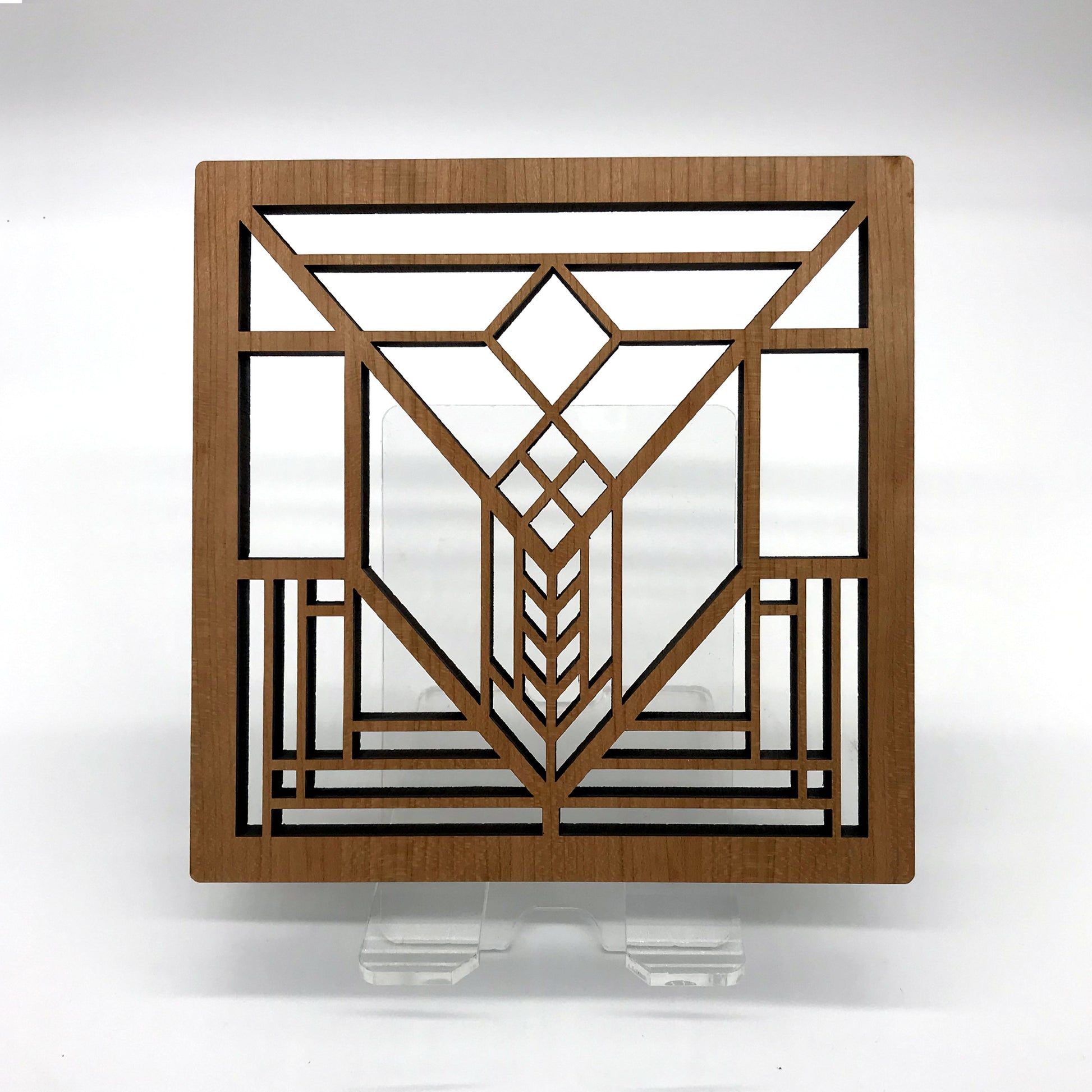 Our trivets are made from 1/2" thick cherry veneered MDF. This wonderful addition to your home comes with rubber feet on the bottom, and can withstand heat up to 400° F. Trivets can also be used as wall art using the included mounting hardware. 7-3/4" x 7-3/4" x 1/2". Acrylic stand not included. All AlaModerna products are made in the USA.