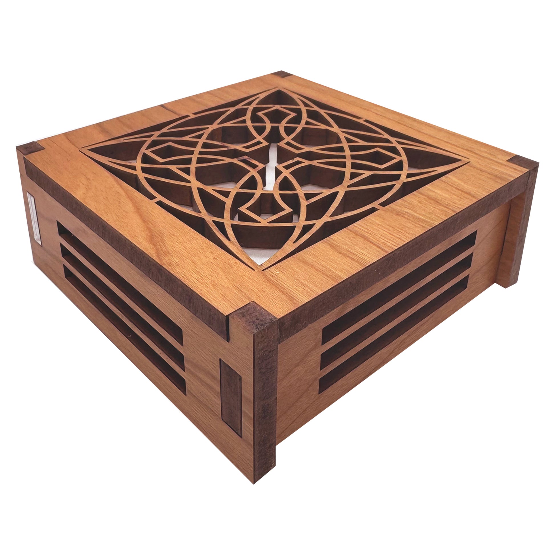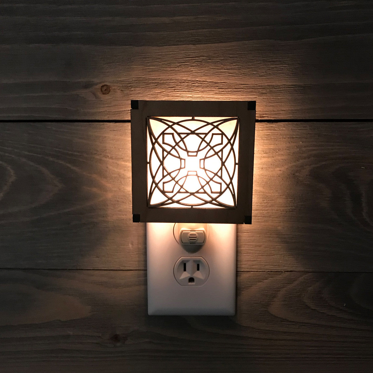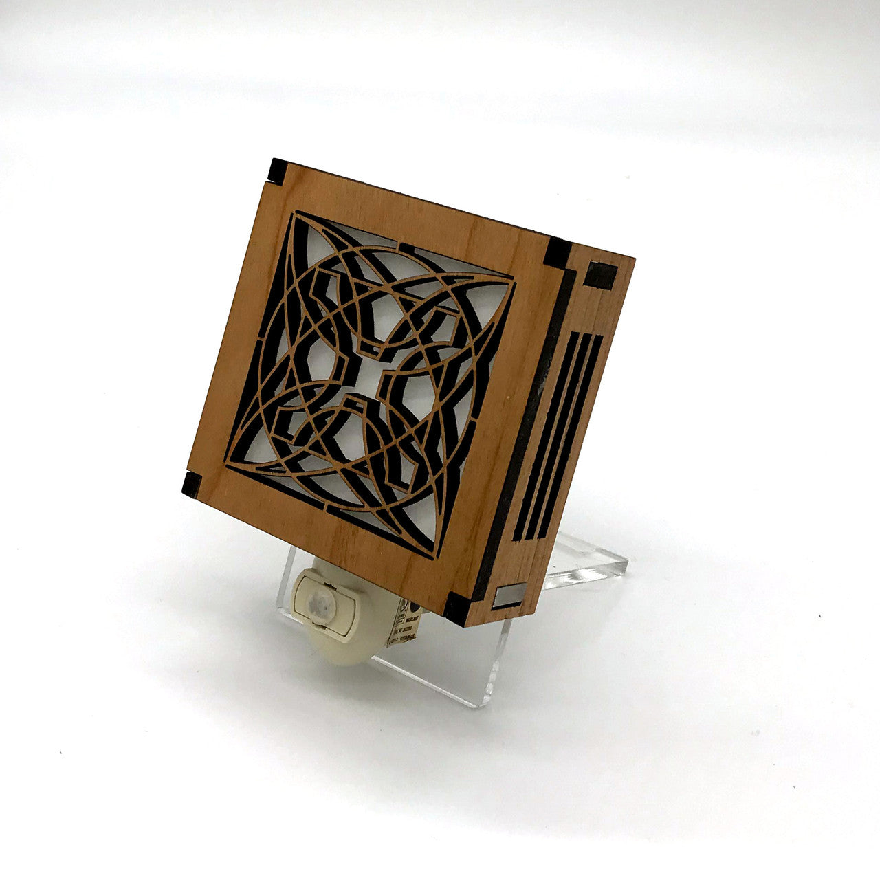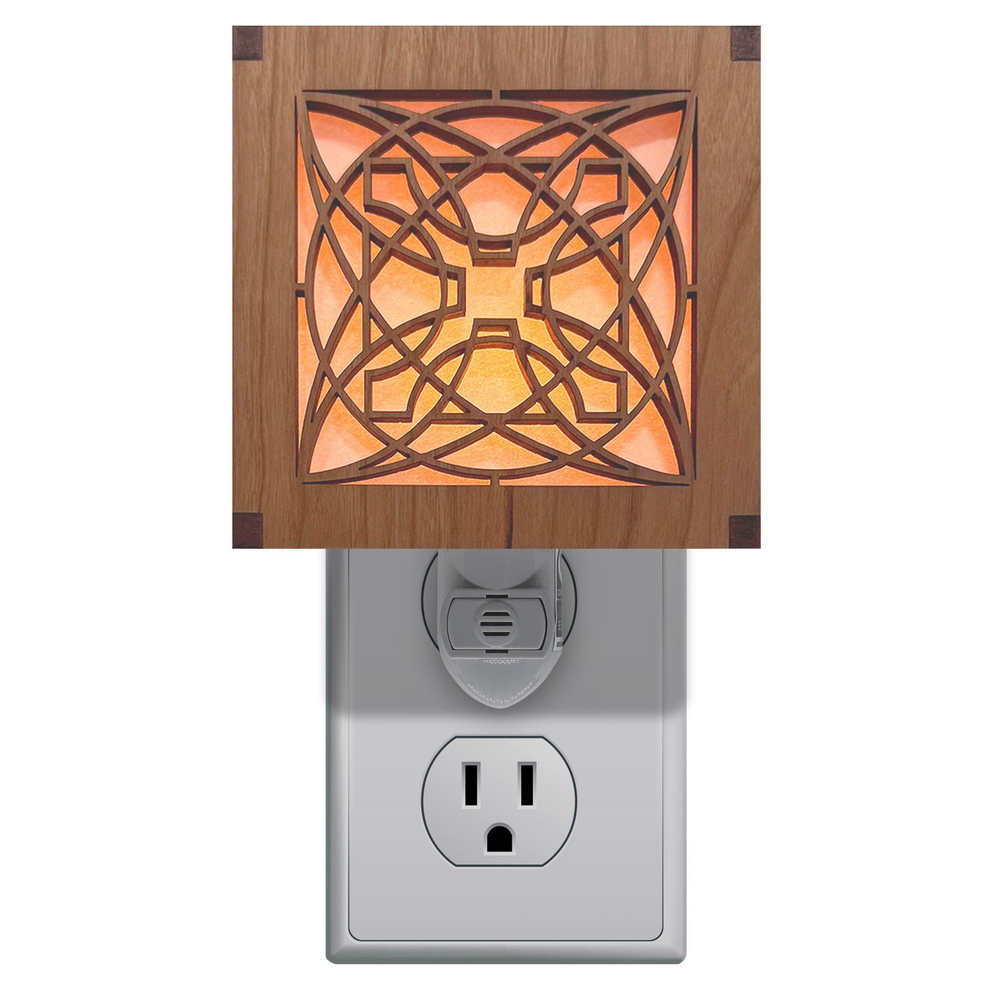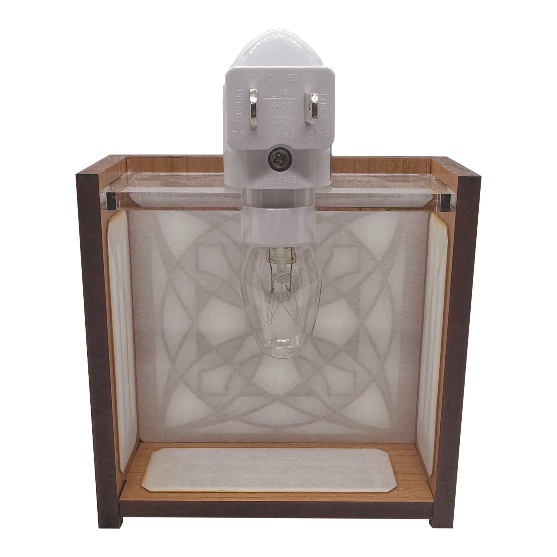 Our Frank Lloyd Wright night lights are made with cherry veneered MDF. This elegant night light feature slats on the top and sides with a clear acrylic bottom panel to allow more light to shine through. The base is white and the night light measures 4" x 4" x 1.5".