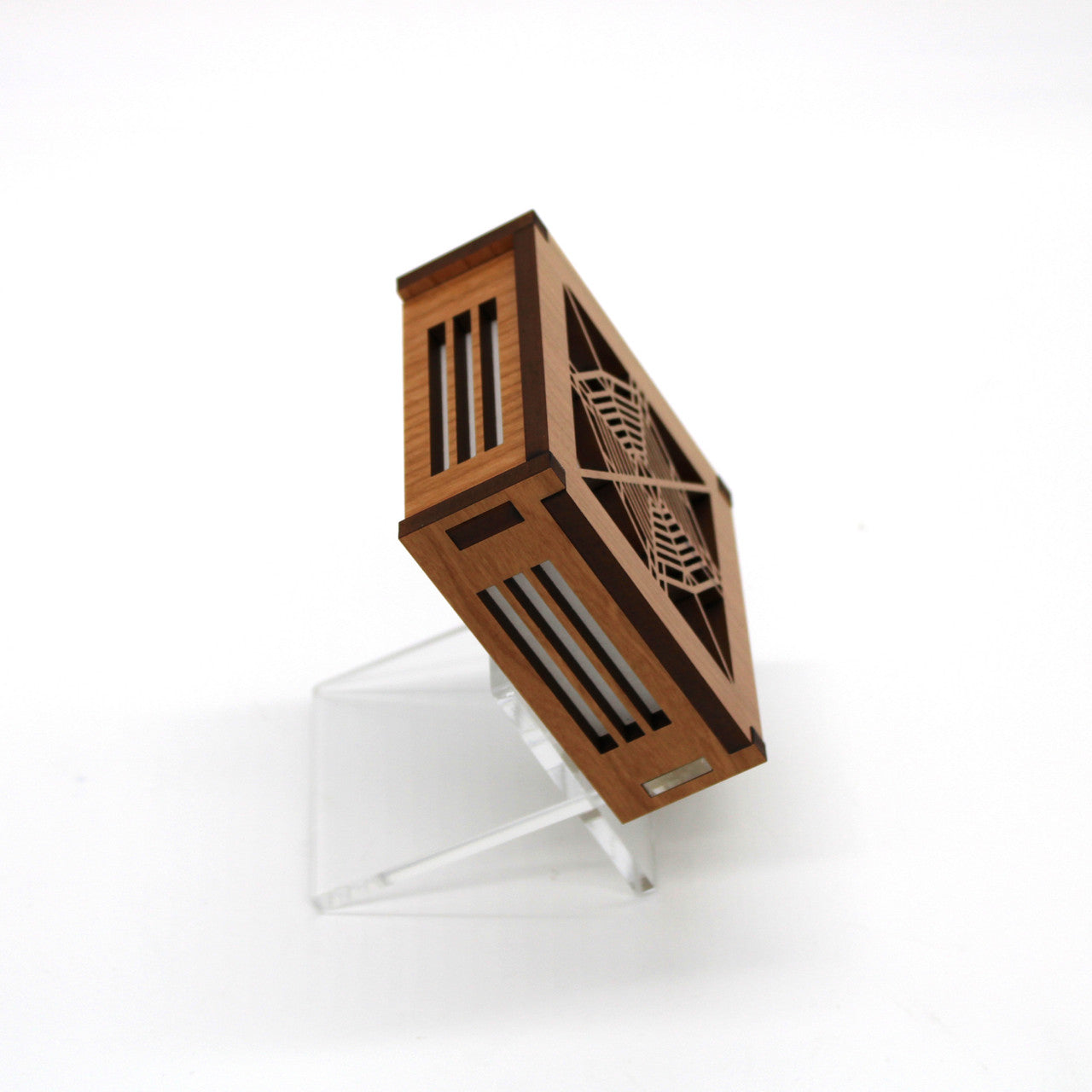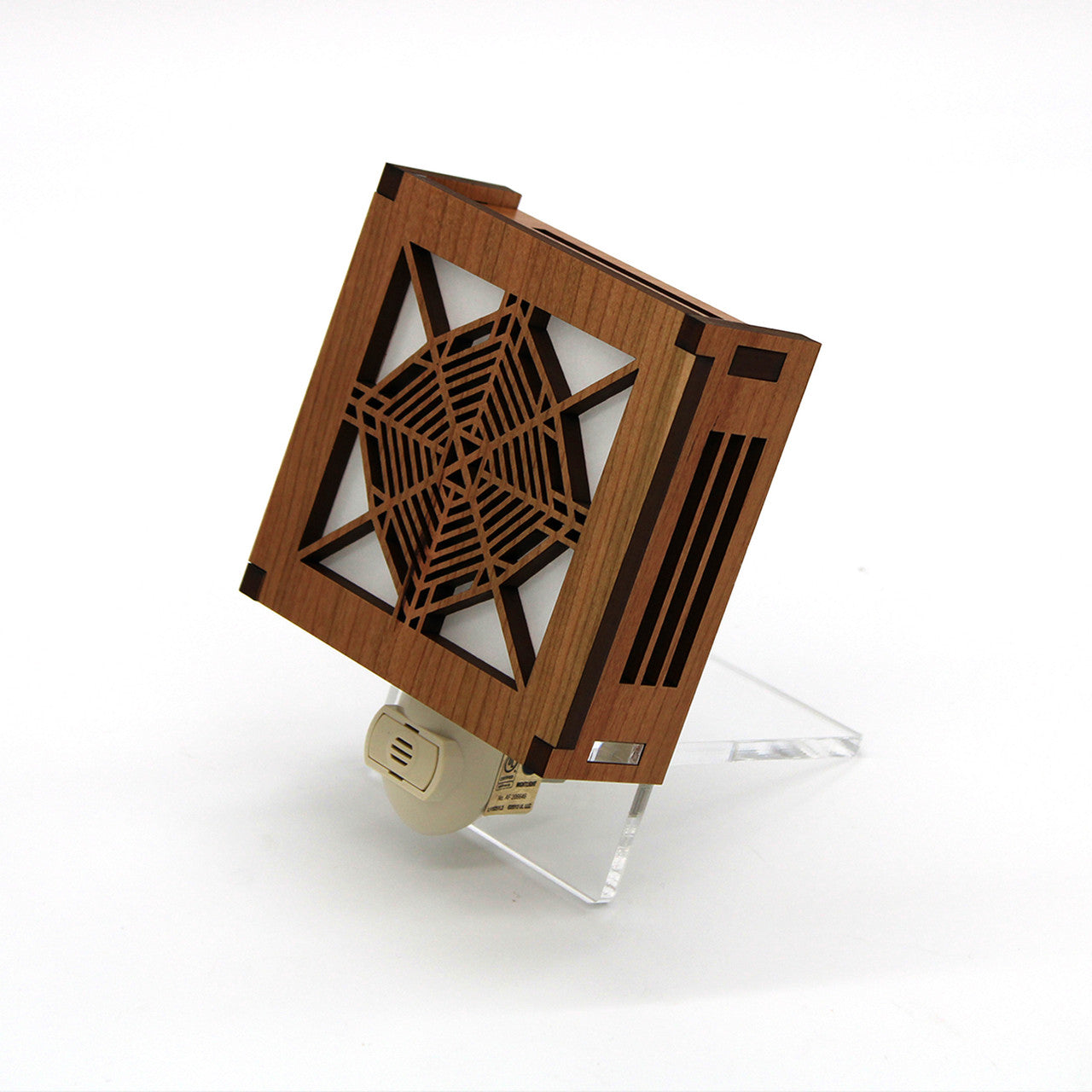 Our Frank Lloyd Wright night lights are made with cherry veneered MDF. This elegant night light feature slats on the top and sides with a clear acrylic bottom panel to allow more light to shine through. The base is white and measures 4" x 4" x 1.5".