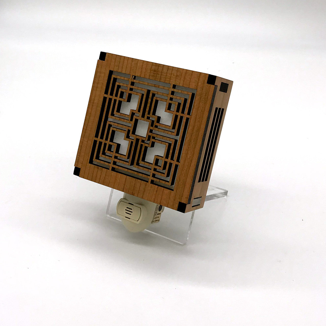 Our Frank Lloyd Wright night lights are made with cherry veneered MDF. This elegant night light feature slats on the top and sides with a clear acrylic bottom panel to allow more light to shine through. The base is white and the night light measures 4" x 4" x 1.5".