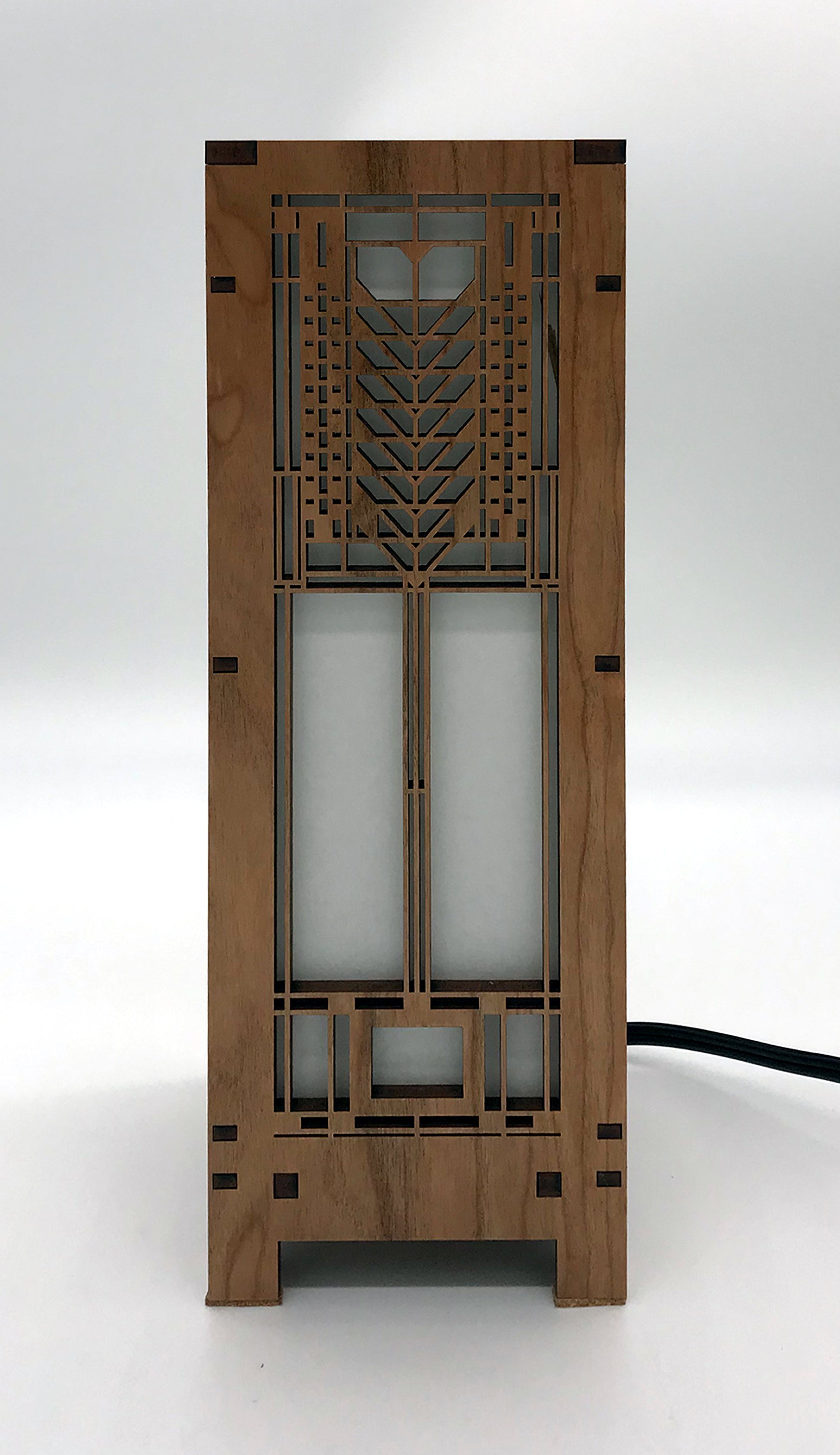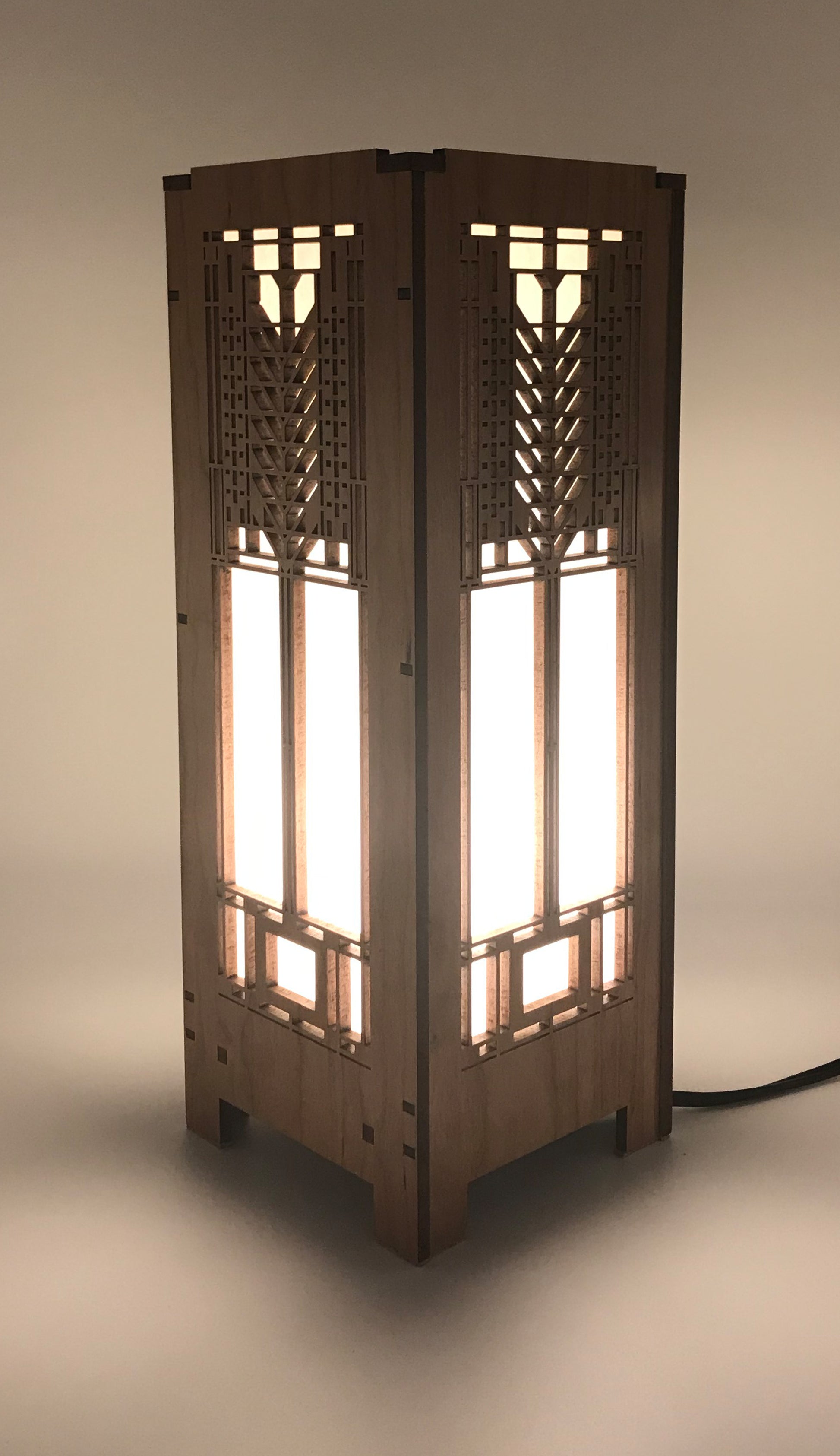 Our lightboxes are made with cherry veneered MDF and heat resistant shoji paper. Each lightbox includes an inline on/off switch on an 8' cord. The candelabra base also includes a 4 watt LED tubular bulb. This mini version of our lightbox measures 4-1/4" x 4-1/4" x 11-1/2" . All AlaModerna products are made in the USA.