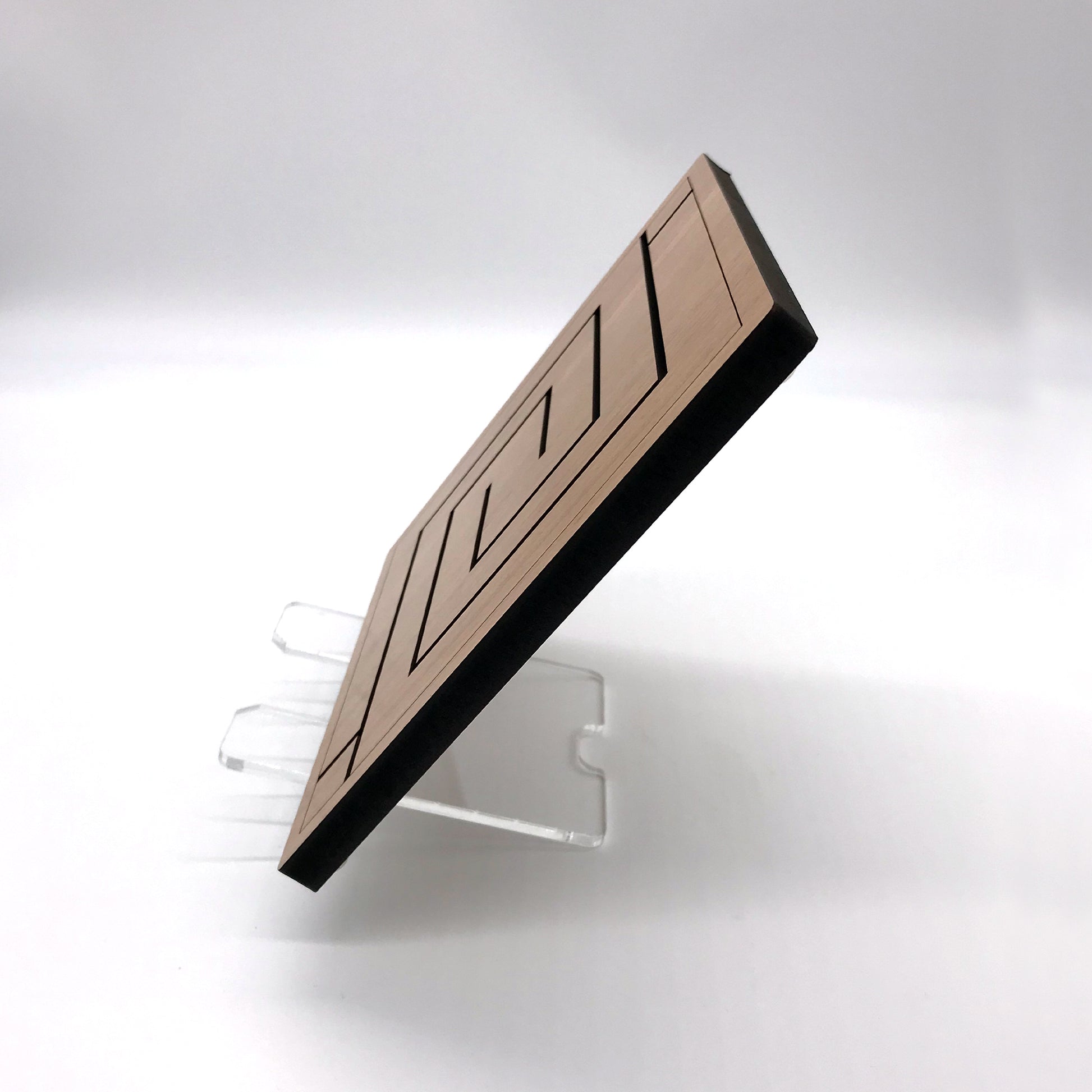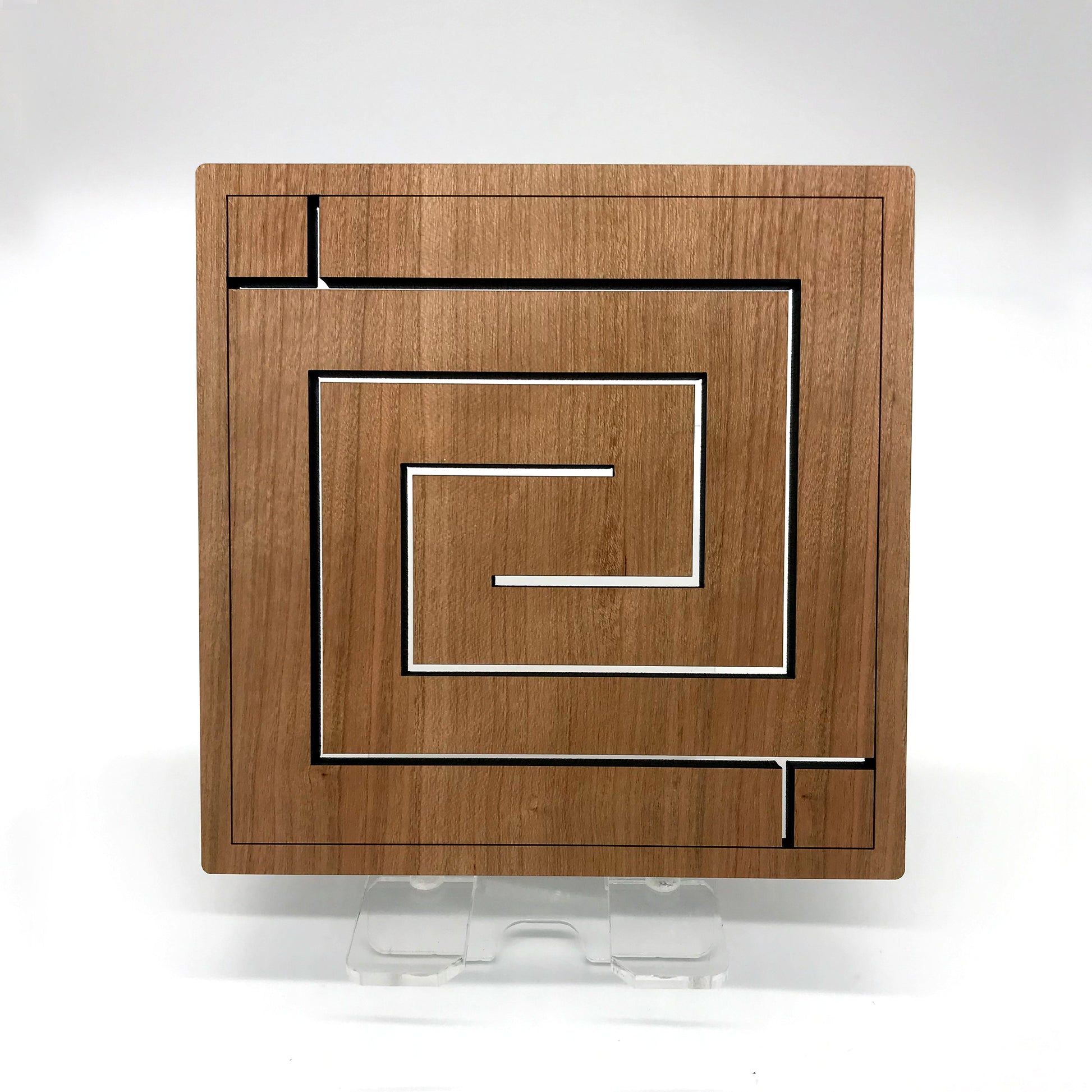 Our trivets are made from 1/2" thick cherry veneered MDF. This wonderful addition to your home comes with rubber feet on the bottom, and can withstand heat up to 400° F. Trivets can also be used as wall art using the included mounting hardware. 7-3/4" x 7-3/4" x 1/2". Acrylic stand not included. All AlaModerna products are made in the USA.